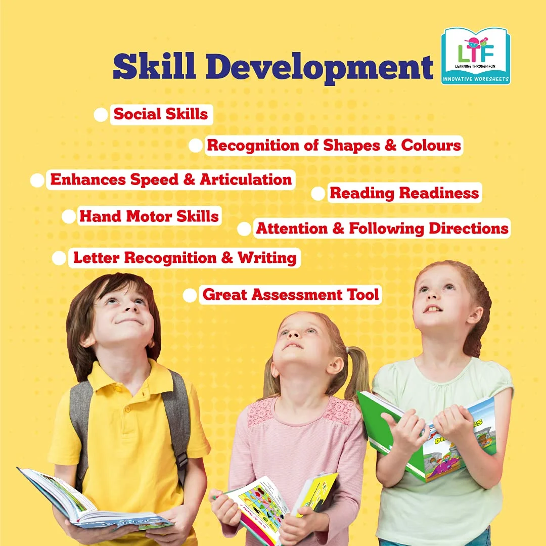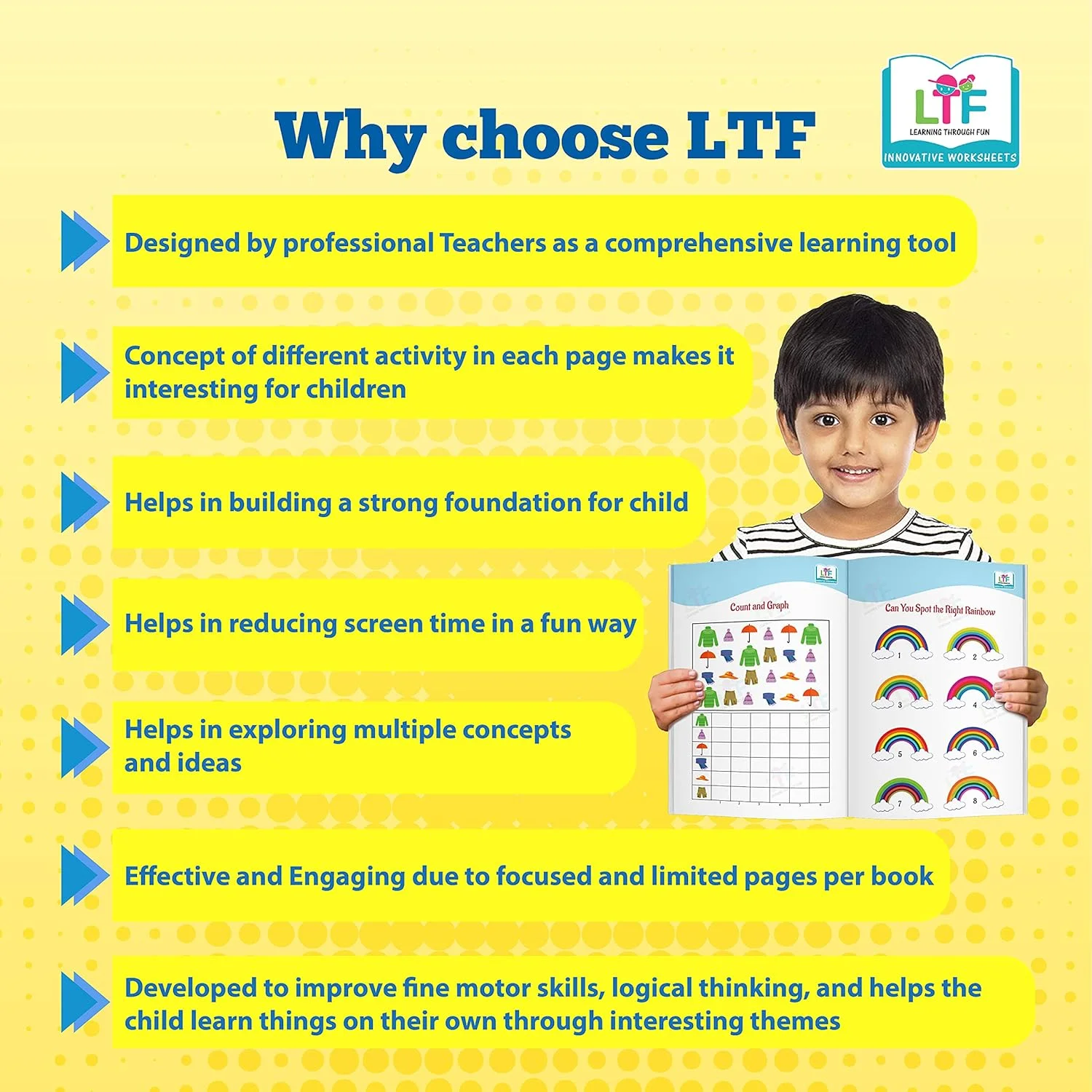 • Worksheets developed to improve attention, direction following, phonetic skills, fine motor skills, logical thinking, problem-solving and help the child learn things on their own through engaging themes.