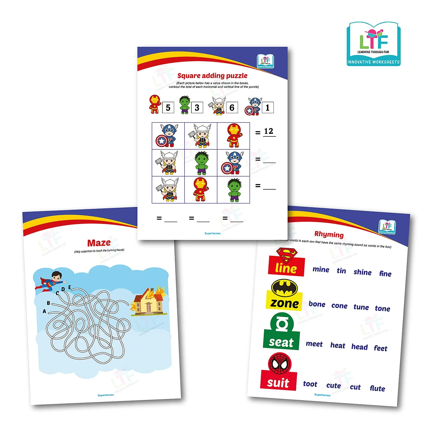 - Activities such as Square addition, Maze, Rhyming Words, and many more are designed keeping in mind the superhero theme. With every activity, kids not only get entertained but also develop helpful skills.